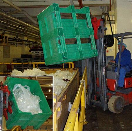 废冰被收集到绿色的 Dolavs卡板箱中更多...